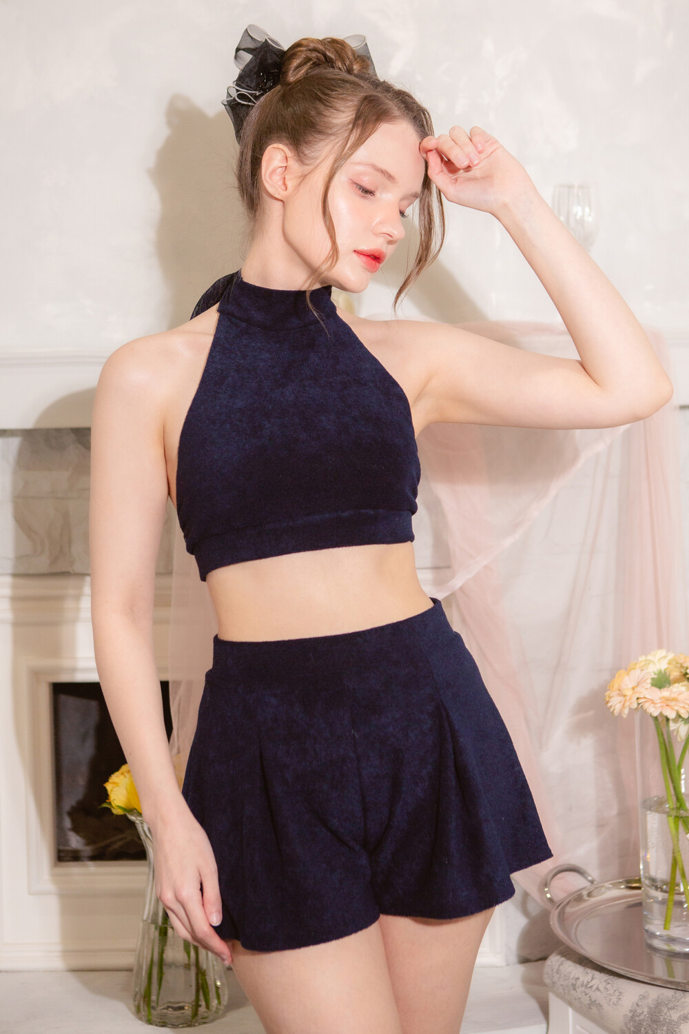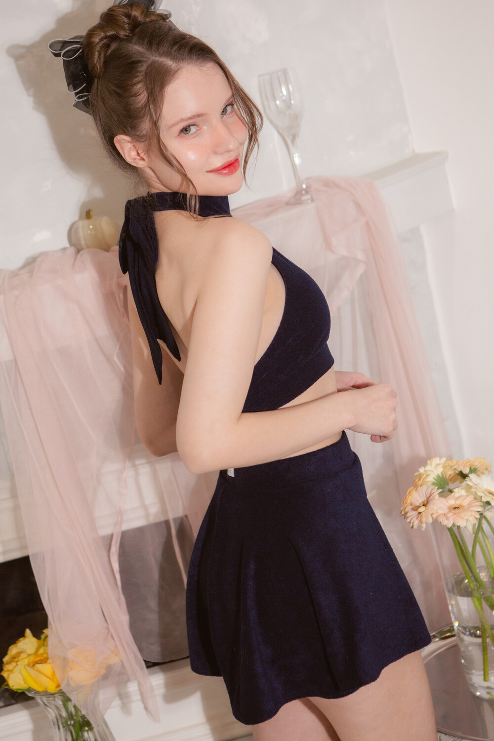 탑은 부드러운 테리 소재에 은은한 펄감이 감도는 쉬폰 리본을 더해 로맨틱한 포인트를 살렸습니다.