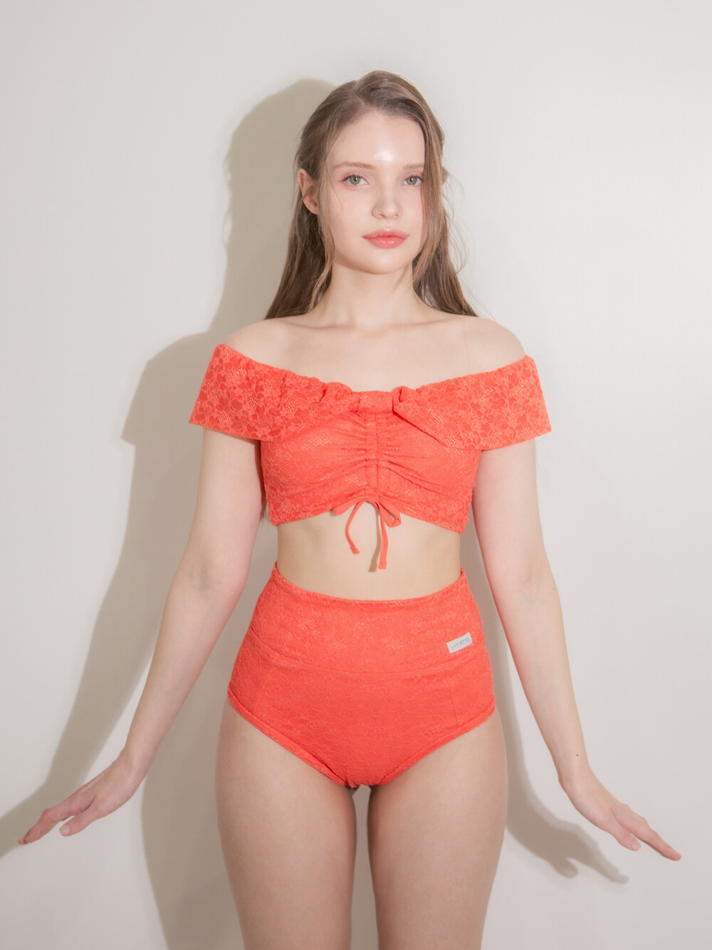 살며시 어깨를 드러내는 오프숄더 디자인과 풍성한 리본 디테일이 어우러져
